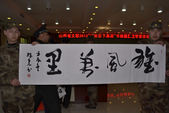 當一位戰士拿到山西省政協常委、省文聯黨組書記、省書協副主席張根虎為他創作的“雄風萬里”、“情韻書聲”書法作品時喜悅之情難以抑制,感慨地說:“我平時也練習書法,今天能親眼目睹這么多名家現場創作,并能得到張書記珍貴的墨跡,非常難得,我會好好學習和收藏這些作品。”