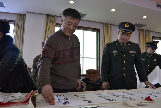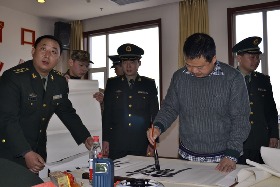 簡短的儀式結束后,由省文聯主席、省書協名譽主席李才旺同志為活動開筆,那飽含真情、蒼勁剛健的“魚水情深”,拉近了官兵們和藝術家們的距離,表達了藝術家們對廣大官兵的崇敬之情。書畫家們隨即投入了緊張的創作中,此時,幾乎每位藝術家的案桌前都被官兵們“團團圍住”,有些甚至排起了長隊。官兵們自選對聯內容,然后由藝術家題寫。“福星高照全家福、春光耀輝滿堂春”、“小康家庭歡樂日、春回大地艷陽天”……一副副對聯寄托著廣大官兵美好的愿望,也凝聚著藝術家們對戰士們的濃濃情意。