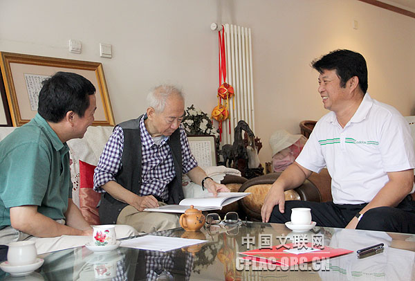 9月1日,中國文聯(lián)黨組副書記、副主席覃志剛在中國文聯(lián)辦公廳副主任劉尚軍等陪同下來到中國文聯(lián)榮譽(yù)委員、中國書協(xié)榮譽(yù)主席沈鵬家中,代表中國文聯(lián)黨組為沈鵬80歲生日送上祝福和生日禮物。圖為覃志剛、劉尚軍與沈鵬共同探討書法藝術(shù)。中國文聯(lián)網(wǎng) 董大汗 攝