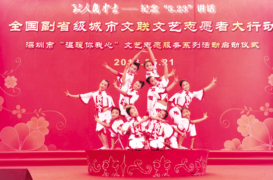 在深圳市文聯(lián)志愿服務(wù)團旗下,組成了羅湖、福田等區(qū)及新區(qū)12個分團,市作協(xié)、市劇協(xié)等協(xié)(學(xué))會等36個服務(wù)隊,形成專兼結(jié)合的基層文化工作隊伍,常年深入社區(qū)、軍營、學(xué)校、企業(yè)、勞教所等,開展文藝演出、藝術(shù)展覽、講座輔導(dǎo)、藝術(shù)培訓(xùn)等活動,讓更多人享受到文化發(fā)展的成果。