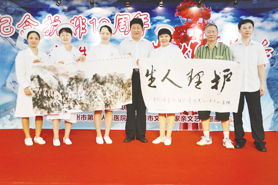 由廣州市文聯(lián)、廣州日報社、廣州市衛(wèi)生局主辦的“紀念抗非10周年,走進當(dāng)年英雄群體”專題文藝志愿服務(wù)活動在廣州市第一人民醫(yī)院舉行。廖新波、劉小毅、喬平、馮國業(yè)、黃卓堅、蔣少艾等領(lǐng)導(dǎo)及廣州市文聯(lián)、廣州市第一人民醫(yī)院240多人參加活動。