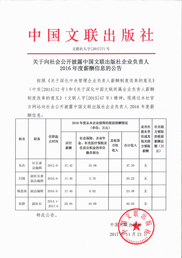 中國文聯(lián)出版社公開企業(yè)負(fù)責(zé)人2016年薪酬