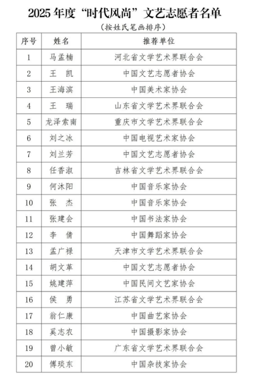 為了積極培育和踐行社會主義核心價值觀,大力弘揚“奉獻、友愛、互助、進步”志愿精神,培育志愿文化,發(fā)揮文藝志愿者先進典型示范引領(lǐng)作用,中國文聯(lián)開展了2025年度“‘時代風尚’文藝志愿者”宣傳選樹項目。經(jīng)過擇優(yōu)推薦、專家推選等環(huán)節(jié),確定了2025年度“時代風尚”文藝志愿者名單,現(xiàn)予以公示。