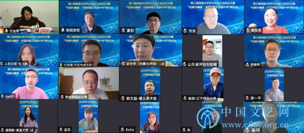 7月14日,由中國文藝評論家協會、中國文聯文藝評論中心主辦,中國文聯網絡文藝傳播中心協辦的“第三屆網絡文藝評論優選匯”暨“回顧與瞻望:中國網絡文藝這十年”研討會在京舉行。圖為網上與會專家學者。
