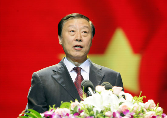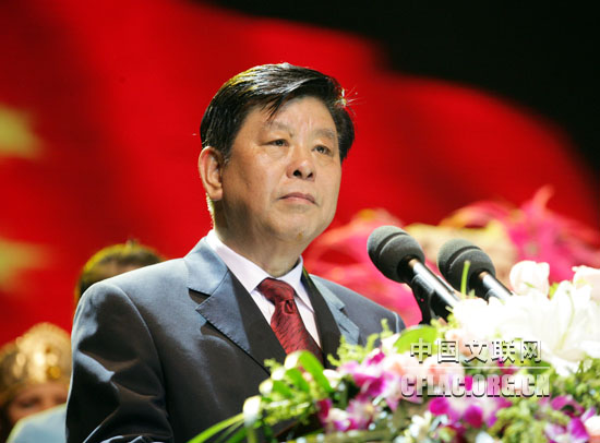 10月7日晚,由中國文聯和江蘇省人民政府共同主辦,江蘇省文化廳、江蘇省文聯、蘇州市人民政府聯合承辦的第八屆中國國際民間藝術節,在蘇州工業園區科技文化藝術中心隆重開幕。中共中央政治局委員、國務委員劉延東發來賀信。全國政協副主席、中國文聯主席孫家正出席開幕式并觀看演出。中國文聯黨組書記、副主席胡振民,江蘇省委副書記、省長羅志軍,中國文聯黨組成員、副主席馮遠,江蘇省委常委、蘇州市委書記蔣宏坤等領導出席開幕式并觀看了演出。開幕式由蘇州市委副書記、市長閻立主持。來自世界五大洲14個國家的近1200名中外藝術家參加了開幕式演出。圖為全國政協副主席、中國文聯主席孫家正宣布藝術節開幕。中國文聯網 孟祥寧 攝