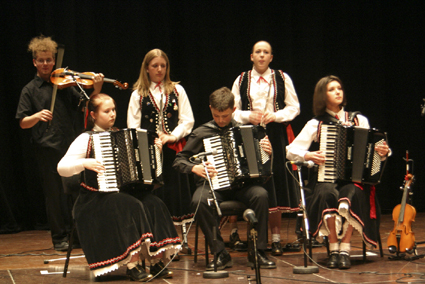 該團的表演中最有意思的一個特點是,演員邊演奏樂器,腳下邊跳著節奏分明的踢踏舞。上下肢各司其責,集舞蹈與音樂于一體,這是個難度不小的技藝,但演員們似行云流水,愉快的踢踏舞步伴著悠揚的小提琴聲發出整齊劃一的聲響。
